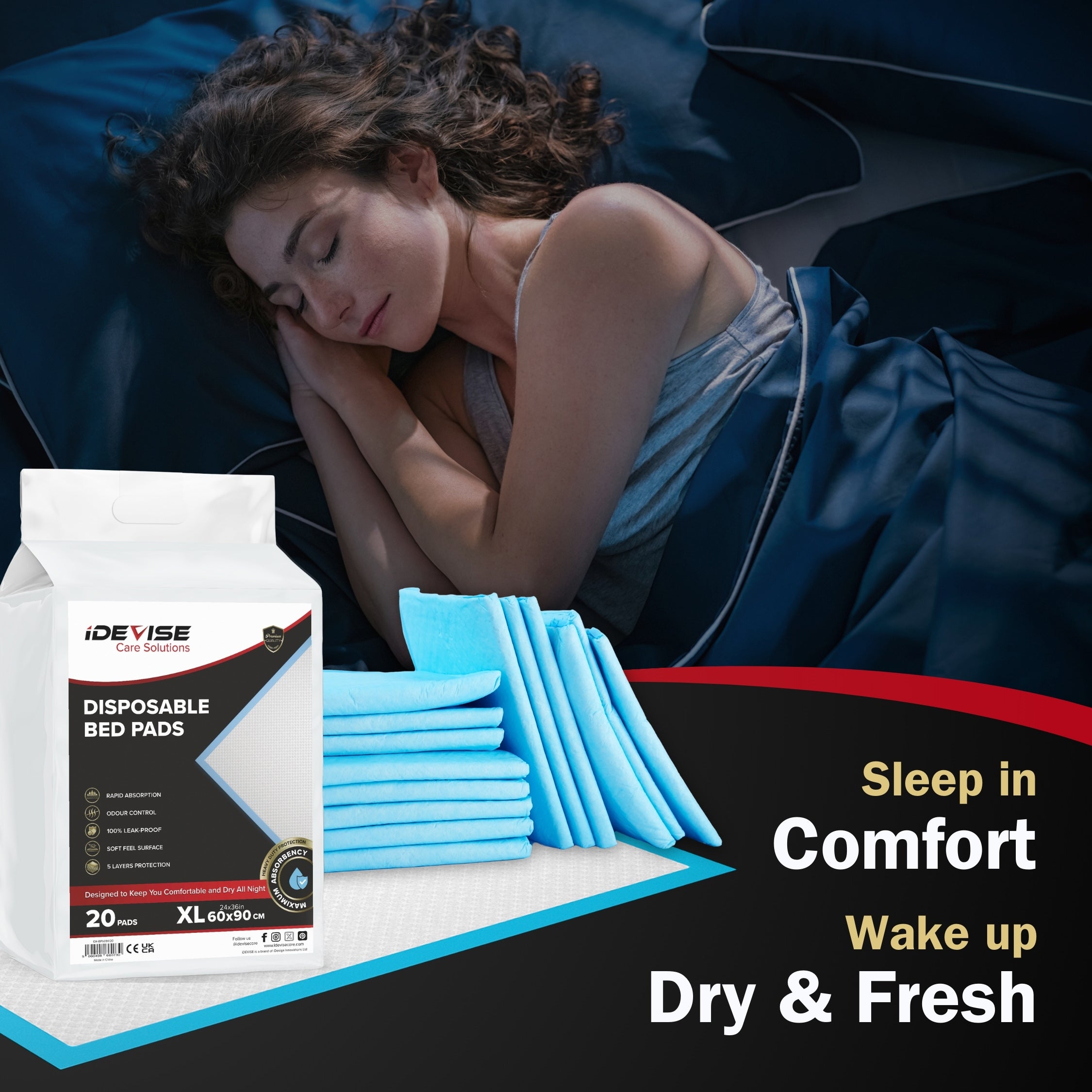 - SOFT TOP LAYER – Prioritising your comfort and wellbeing. The ultra-soft top layer of our bed pads for incontinence adults is gentle on sensitive skin, reducing the risk of irritation or discomfort. Designed for people with incontinence, the soft and smooth surface provides a soothing experience, ensuring a restful and worry-free night.